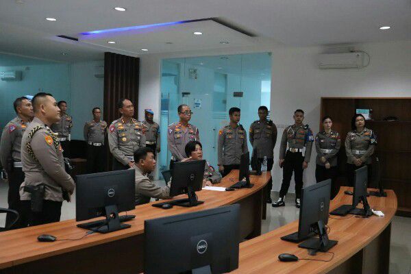 Kapolda memantau langsung aktifitas petugas RTMC yang sedang memantau dan mengawasi arus lalu lintas di jalan raya melalui layar monitor.