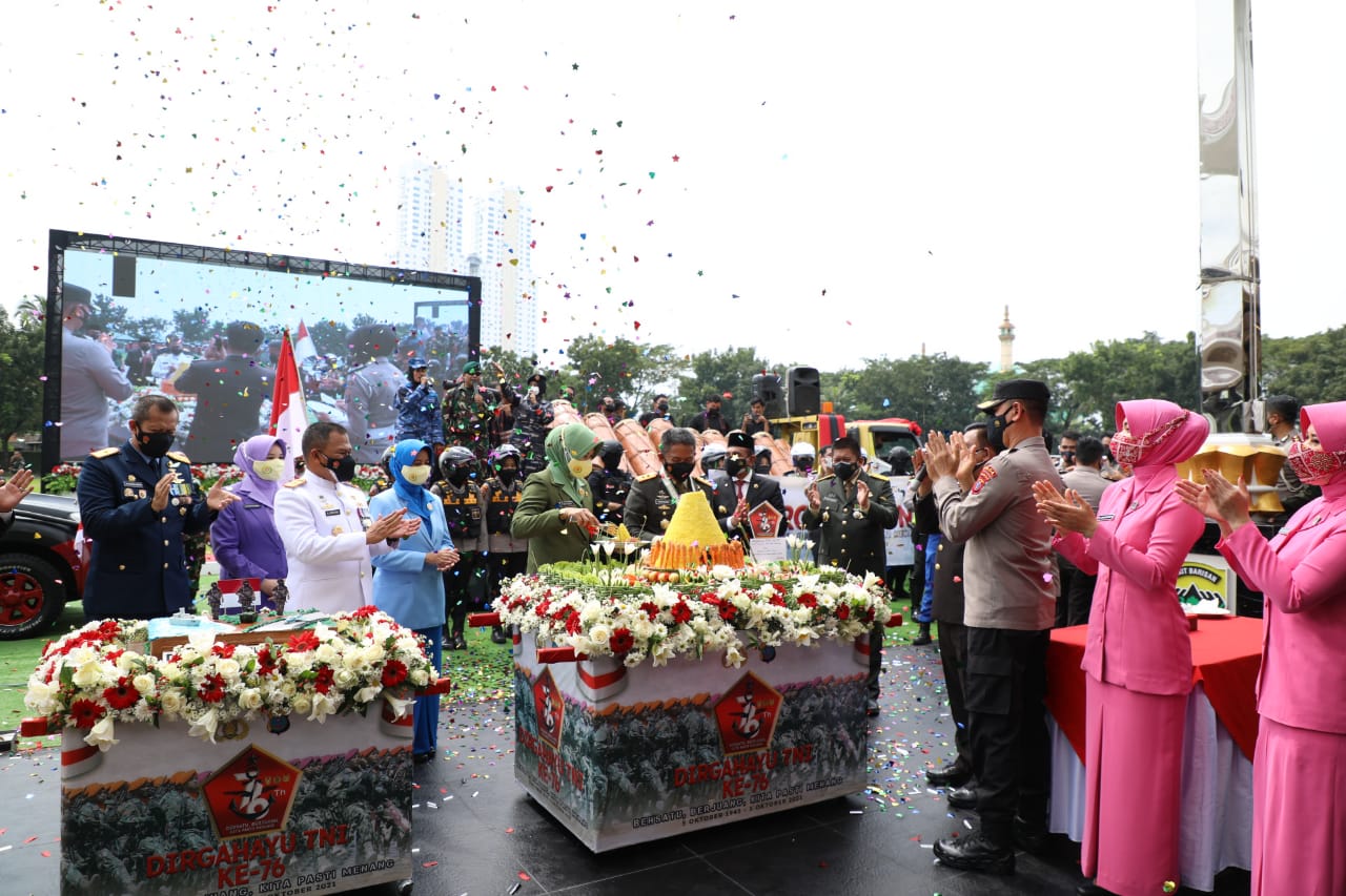 Selanjutnya, Kapolda Sumut bersama Pangdam I/BB, memotong nasi tumpeng dalam memeriahkan hari ulang tahun TNI ke-76. Tetap selama pelaksanaan mematuhi protokol kesehatan mencegah penyebaran Covid-19.