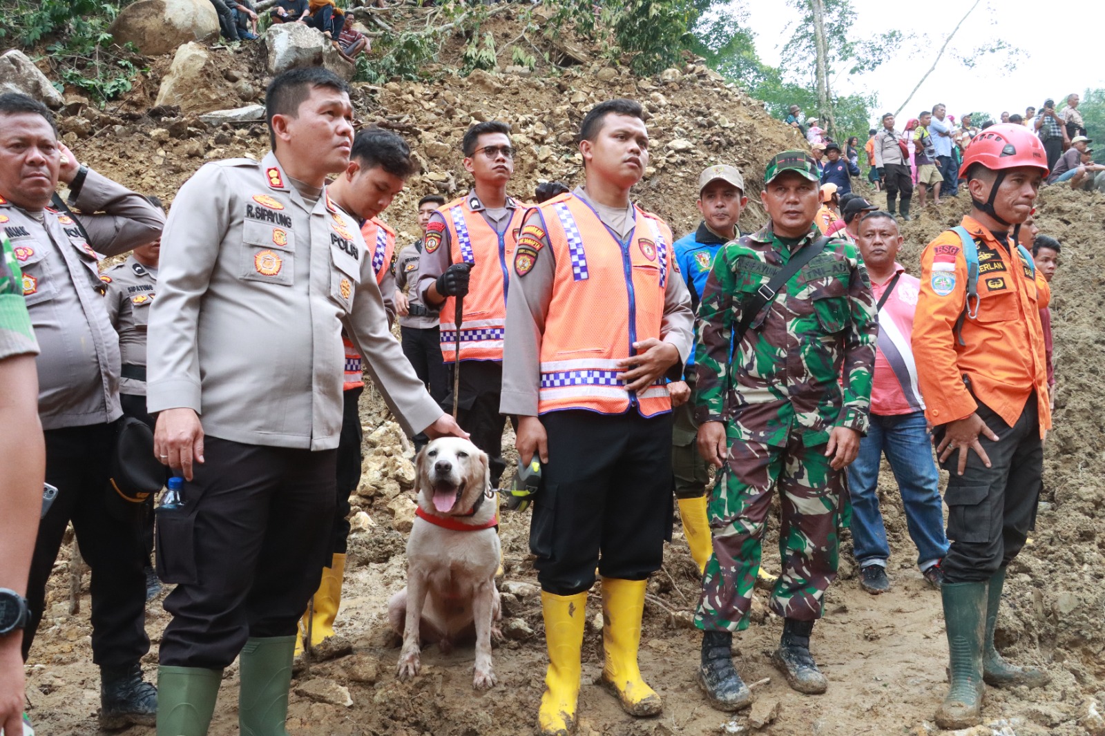 Selanjutnya Kapolres menyampaikan bahwa Tim gabungan yang melaksanakan pencarian saat ini mendapat dukungan personel dari K9 SAR Sat Samapta Polda Sumut untuk melakukan pencarian, “Kita juga didugung oleh Unit Satwa Samapta Polda Sumatera Utara yang membantu untuk mencari dan mengendus kira-kira sumber-sumber bau yang mungkin bisa menjadi patokan bagi tim untuk melakukan kegiatan pencarian.Kamis 19 Oktober 2023 Tim gabungan masih melaksanakan kegiatan dengan melakukan pencarian dan perluasan serta memfokuskan kepada titik-titik yang tadi sudah kita diskusikan antara Polres, Kodim, BPBD, Basarnas, Camat, Forkopimca, untuk memfokuskan titik-titik, atau lokasi-lokasi yang akan kita kerjakan dan kita fokuskan untuk kegiatan pencarian, “tegas AKBP Ronald.