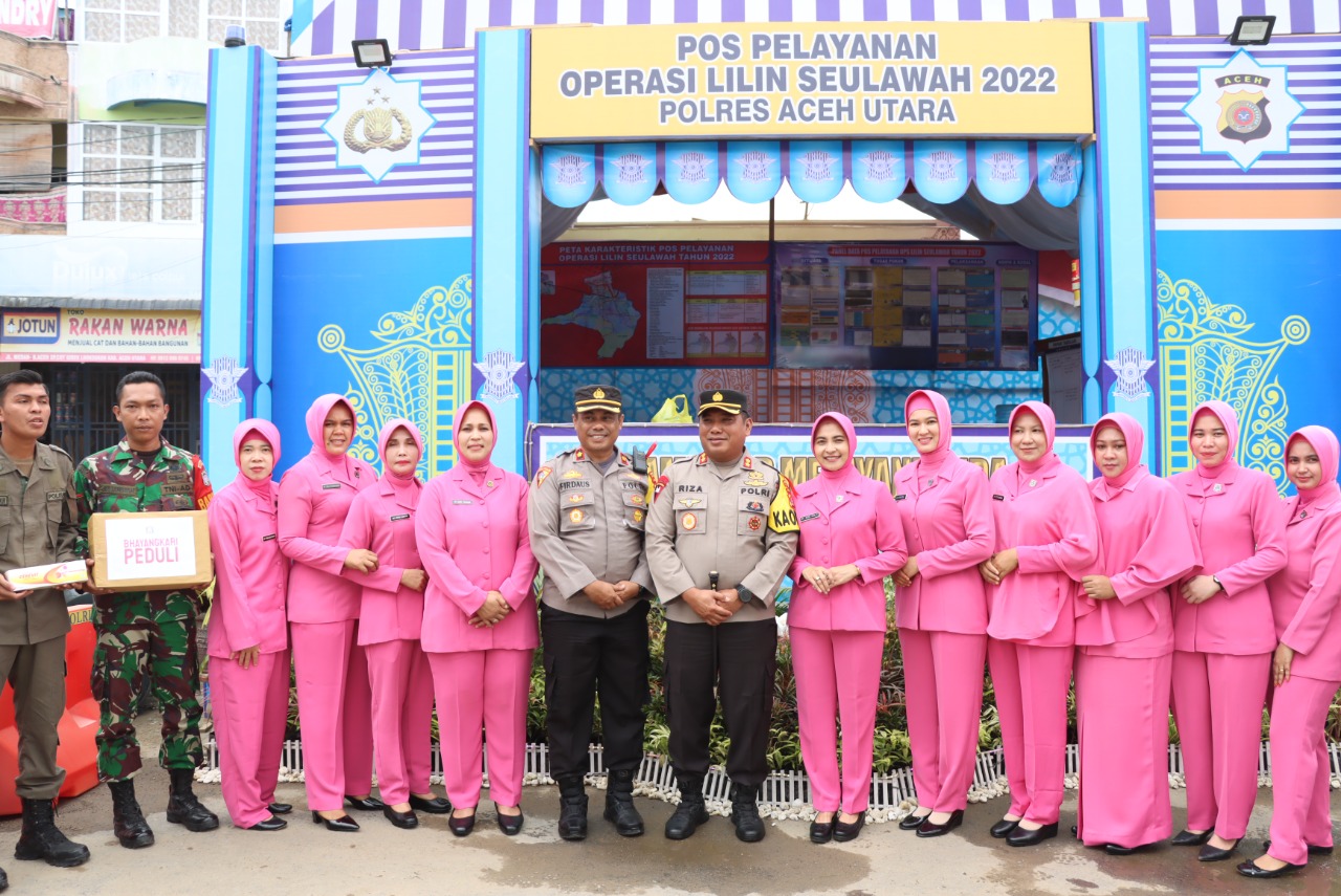 Lhoksukon – Maspolin.id|| Kapolres Aceh Utara AKBP Riza Faisal, S.I.K., M.M Bersama Ketua Bhayangkari Cabang Aceh Utara Ny. Dede Riza Faisal beserta rombongan melaksanakan kegiatan Bakti Sosial Bhayangkari Perduli kepada Personel Pos Pengamanan/Pelayanan Ops Lilin Seulawah 2022 Polres aceh utara, Selasa (27/12/2022).