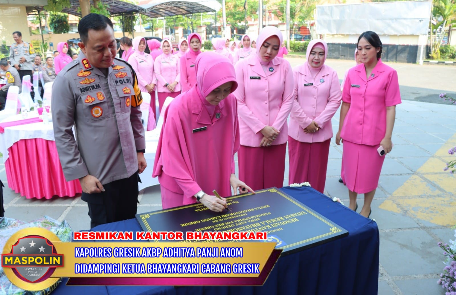 Gresik – Maspolin.id|| Kapolres Gresik AKBP Adhitya Panji Anom didampingi Ketua Cabang Bhayangkari Gresik Myrna Adhitya meresmikan Kantor Bhayangkari Cabang Gresik di Jalan Basuki Rahmat Kecamatan Kota Gresik kabupaten Gresik, Sabtu (09/12/2023).