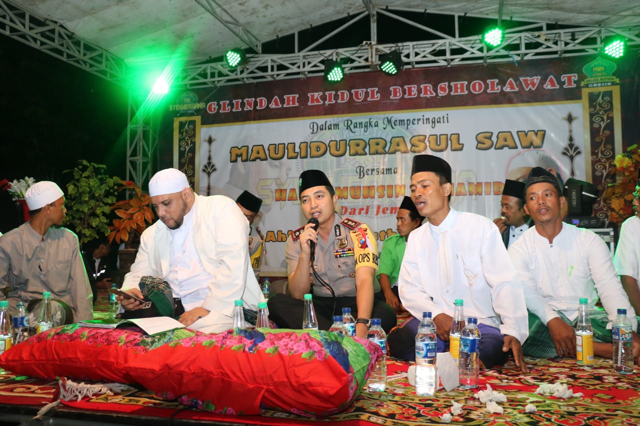 Gresik,Maspolin.id – Kapolres Gresik AKBP Wahyu S Bintoro, SH SIK MSi, Sabtu (5/1) malam menghadiri Acara Maulid Nabi Muhammad SAW yang digelar di Dusun Glindah Kidul Desa Glindah Kecamatan Kedamean Kabupaten Gresik.