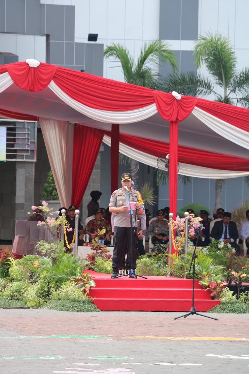 Selanjutnya Kapolres Gresik AKBP. Wahyu S Bintoro., SH., SIK.,M.si didampingi Bapak Bupati Gresik Dr. Ir. H. Sambari Halim Radianto.,ST.,M.si dan Jajaran Forkopimda Lainnya Memberikan selamat dan semangat kepada Peserta Apel.