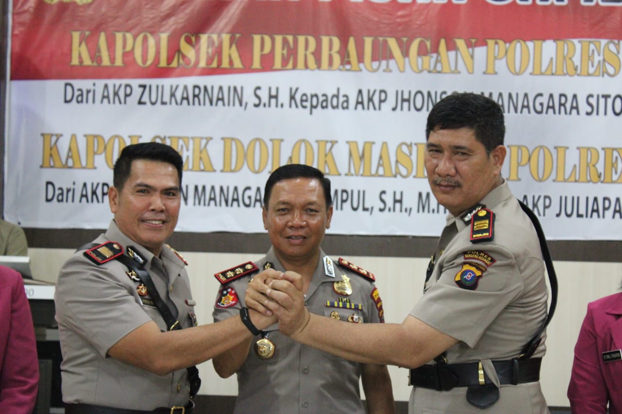 Sergai, Maspolin.id—Kapolres Sergai AKBP Robin Situmorang SH, M.Hum pimpin Serah Terima Jabatan (Sertijab) 2 Kapolsek Jajaran Polres Sergai. Adapun Kapolsek yang di Sertijab yaitu Kapolsek Dolok Masihul AKP Jhonson Sitompul SH, MH kepada AKP Juliapan Panjaitan dan Kapolsek Perbaungan AKP Zulkarnain kepada AKP Jhonson Sitompul SH, MH.