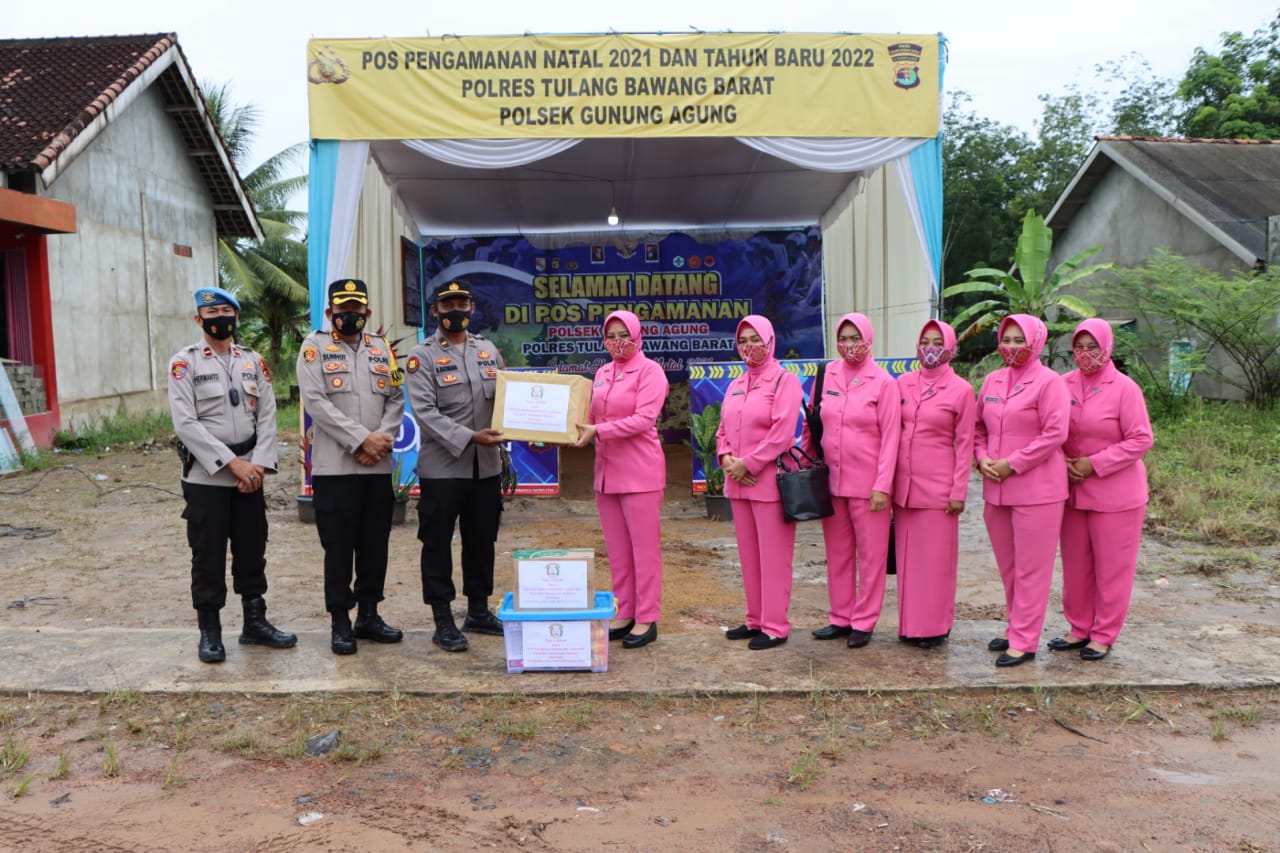 Kapolres didampingi ketua Bhayangkari cabang Tulang Bawang Barat ibu Fenty Sunhot dan wakil ketua bhayangkari ibu Heriyani Zulkarnaen berkunjung ke Pos Pam dan Pos Yan untuk memberikan bingkisan.
