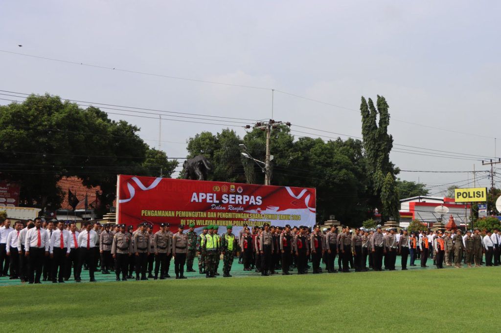 Cirebon Kota – Maspolin.id|| Kapolresta Cirebon, Kombes Pol Sumarni, S.I.K, S.H, M.H, mengikuti Apel Persegeseran Pasukan (Serpas) Pengamanan Pemungutan dan Penghitungan Suara Pemilu 2024 secara virtual . Kegiatan tersebut berlangsung di lapangan apel Mapolresta Cirebon dan turut dihadiri jajaran Forkopimda Kabupaten Cirebon.
