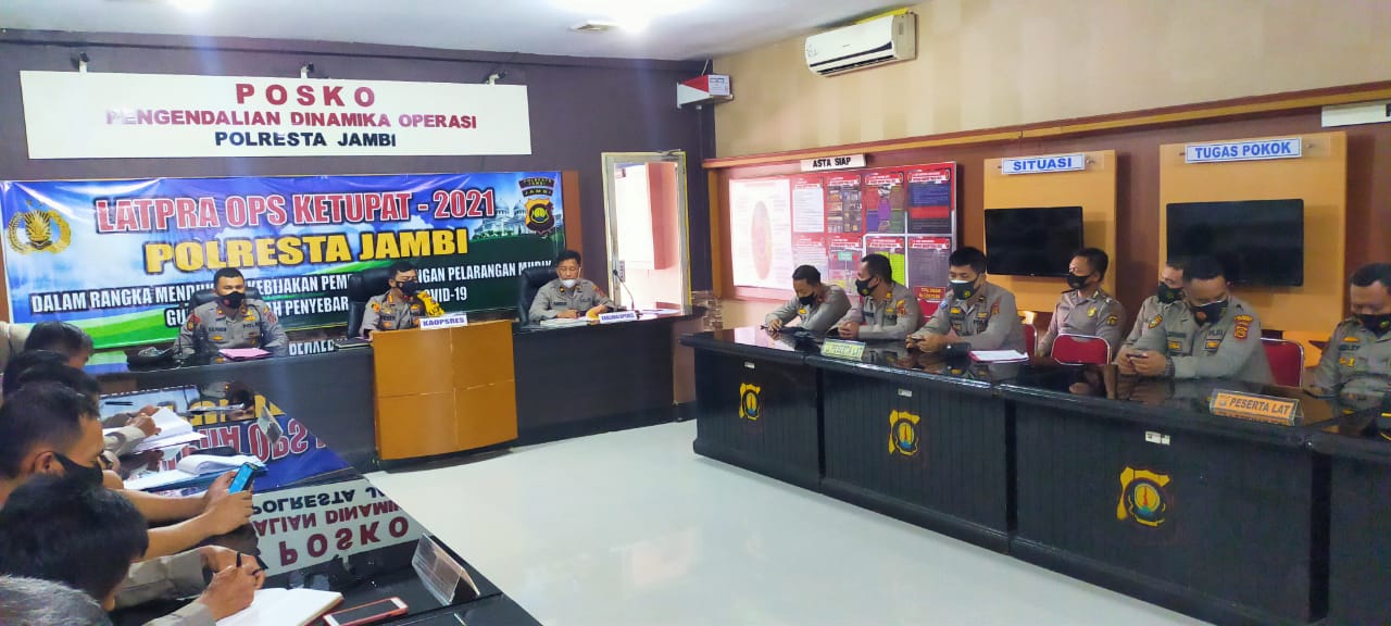 Jambi, Maspolin.id—Kapolresta Jambi Kombes Pol. Dover Christian, S.I.K., M.H. Memimpin kegiatan LATPRA OPS KETUPAT 2021 Dalam rangka mendukung kebijakan Pemerintah dengan pelarangan mudik guna mencegah penyebaran virus Covid-19,