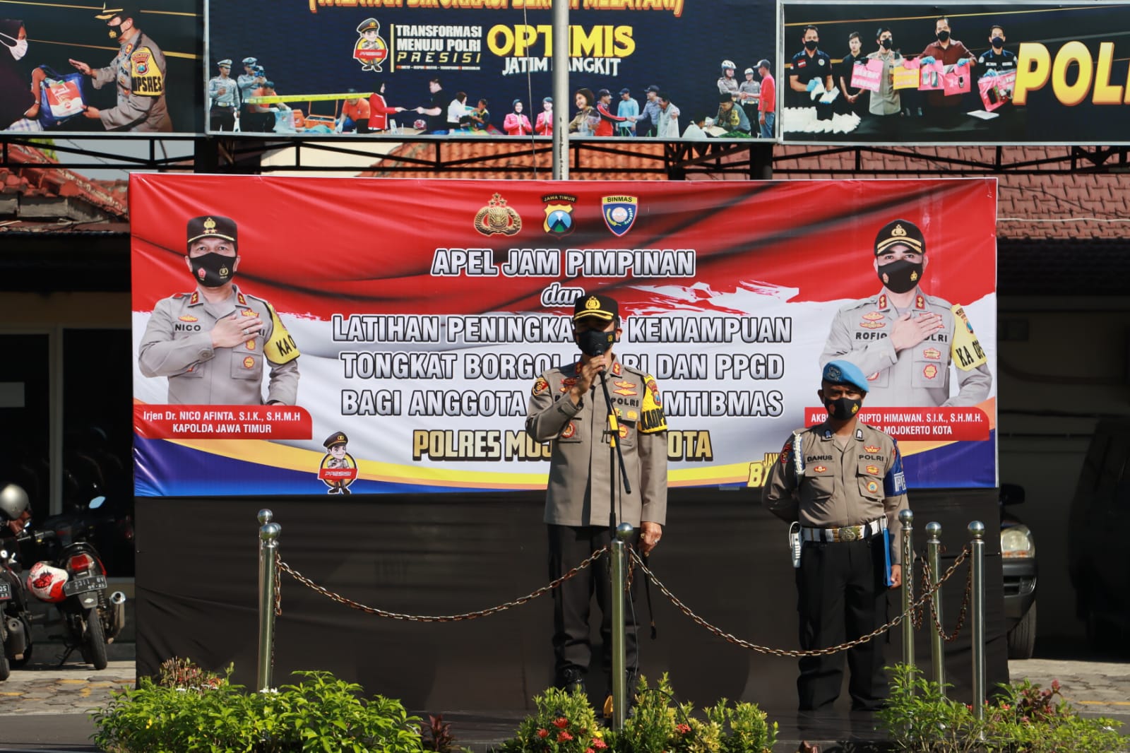 maspolin.id, Mojokerto – Sebagai bentuk pengawasan kedalam pada anggota, Kapolresta Mojokerto, AKBP Rofiq Ripto Himawan memimpin apel pagi jam Pimpinan di lapangan Patih Gajah Mada yang diikuti seluruh anggota, Senin (23/05/22) pagi.