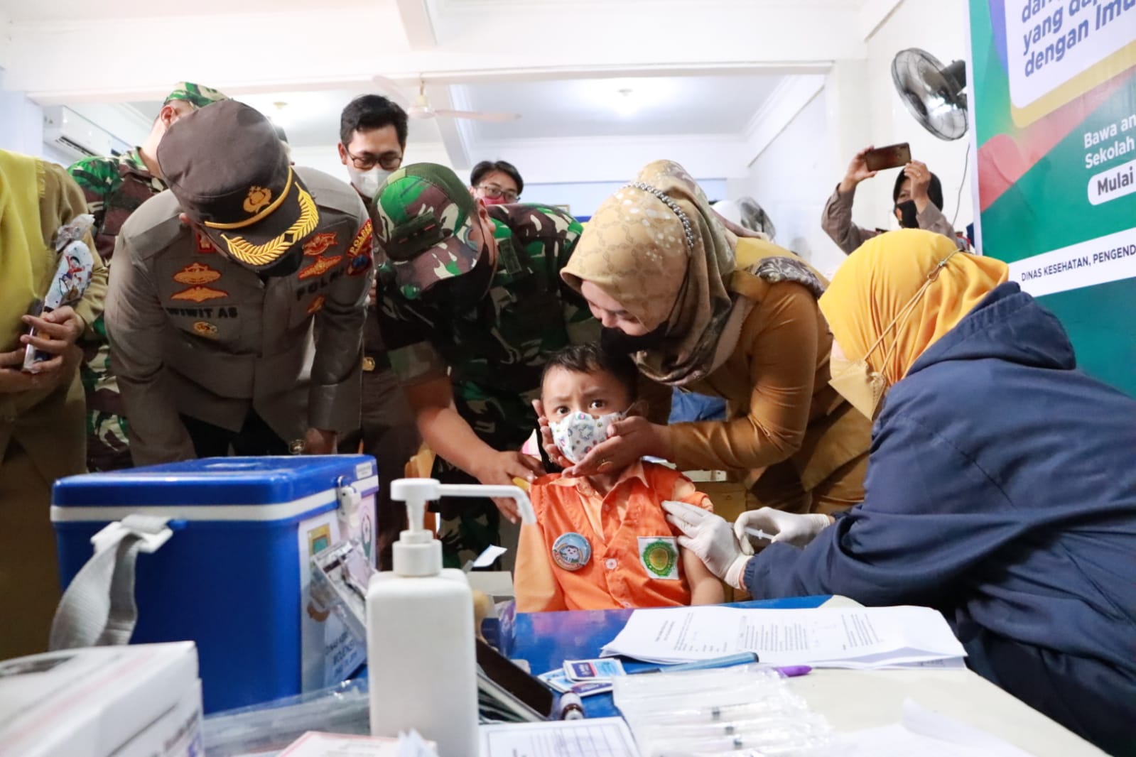 Mojokerto – Maspolin.id|| Kapolresta Mojokerto AKBP Wiwit Adisatria S.I.K., S.H., M.T. mendampingi Walikota Mojokerto Hj. Ika Puspita Sari, S.E. dan Dandim 0815 Mojokerto Letkol Inf Beni Asman, S.Sos., M.H. dalam rangka kegiatan Peninjauan Bulan Imunisasi Anak (BIAN) di TPA Arrosyiid Muslim Scholl Jalan Raya Ijen Nomor 120 – 122 Kecamatan Magersari Kota Mojokerto. Senin (01/08/2022)