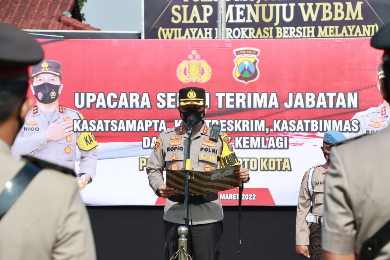 Dalam sambutanya Kapolresta Mojokerto AKBP Rofik Ripto Himawan, S.I.K, S.H, M.H menyampaikan, “Mutasi jabatan adalah suatu proses alamiah dan biasa, salah satu wujud dinamika organisasi agar dapat terus bergerak maju guna menghadapi tantangan tugas dan tuntutan masyarakat yang semakin tinggi dan semakin komplek terhadap kinerja Polri serta upaya penyegaran kepemimpinan secara simultan dan berkesinambungan dalam rangka pembinaan karier serta tetap terpeliharanya daya managerial secara optimal”.