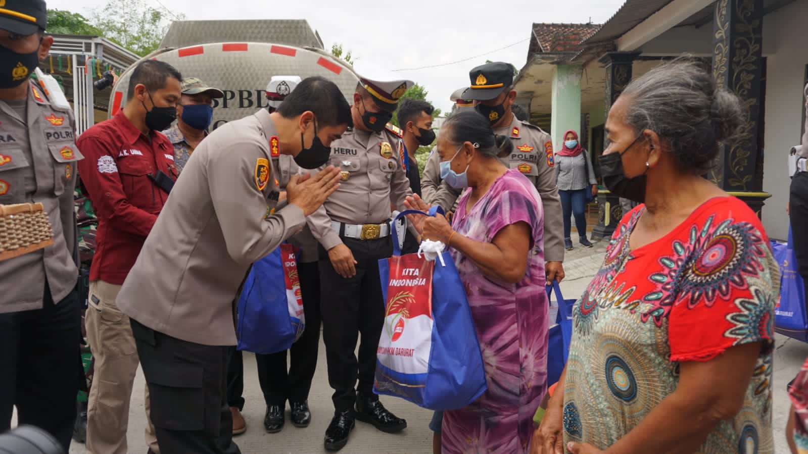 Penyerahan 100 paket bansos yang berisi kebutuhan pokok, obat-obatan, vitamin, snack dan alat protokol kesehatan (Masker) serta cairan Pro-biotik tersebut langsung diserahkan oleh Kapolresta Mojokerto, AKBP. Rofiq Ripto Himawan, SIK., SH,. MH., kepada warga, disaksikan oleh Danramil Pgs 0815/08 Dawarblandong, Letda Inf Subini dan Kades Desa Banyulegi, Toni.