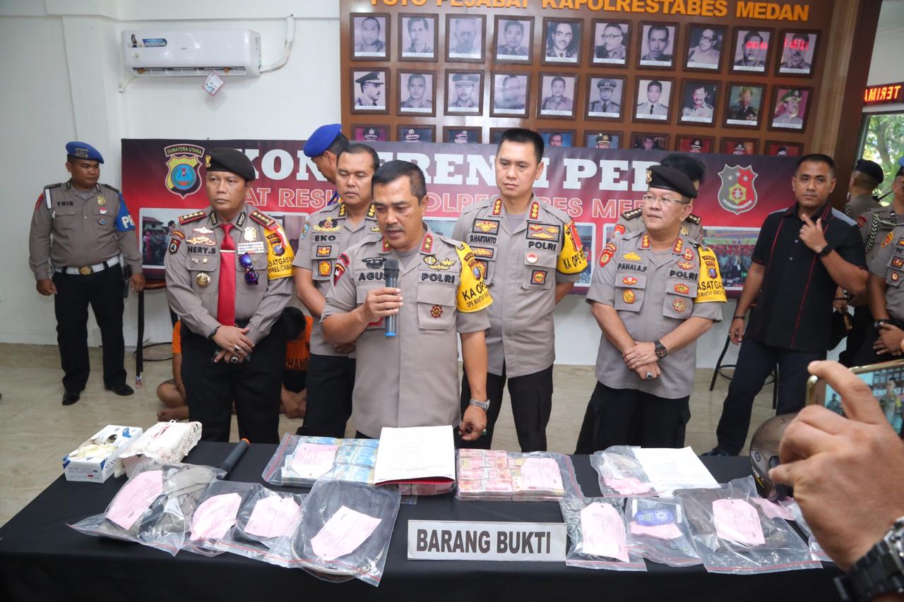 Press Release ini Dipimpin Oleh Bapak Kapolda Sumut Irjen Pol Drs Agus Andrianto,SH,MH Dan Didamping Oleh Kapolrestabes Medan Kombes Pol Dr Dadang Hartanto,SH,SIK,MSi Bersama Pju Polda Sumut,Kasat Reskrim Polrestabes Medan Akbp Putu Yuda Prawira,SH,MH,Kasubag Humas Polrestabes Medan Kompol Edward Nauman Saragih,SH, Kapolsek Medan Kota Kompol Revi Nurvelani,SIK dan Personel Polrestabes Medan.