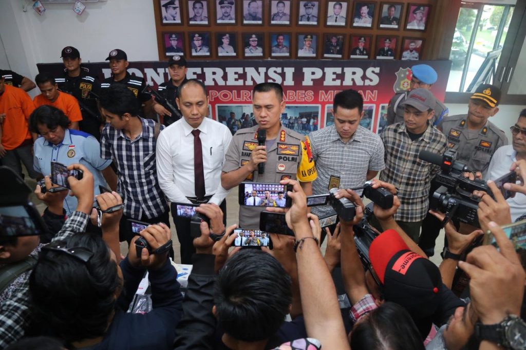 Medan, Maspolin.id—Kapolrestabes Medan Kombes Pol Dr Dadang Hartanto, SH, SIK, MSi Melaksanakan Konferensi Pers Kasus Pencurian di Pelataran Parkir Gubsu yang dilaksanakan Di Loby Gedung Utama Polrestabes Medan Jalan H M Said No 1 Medan, Selasa 1 Oktober 2019.