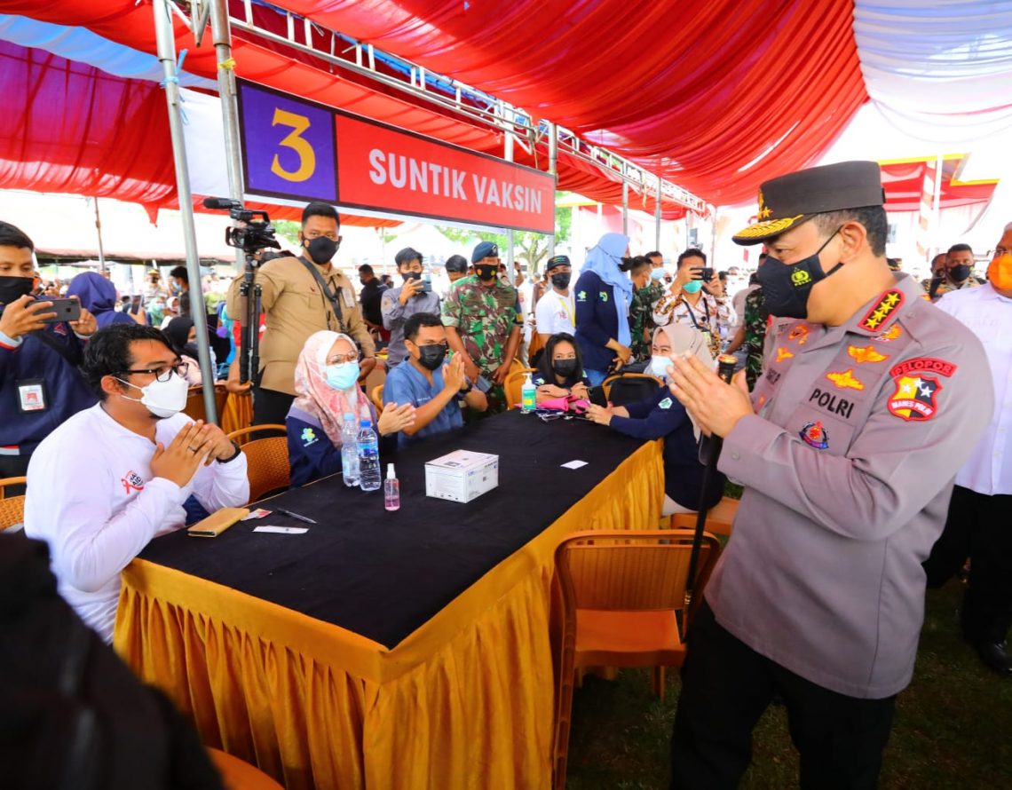 “Jangan ragu-ragu untuk ikut vaksinasi, petugasnya siap, pesertanya siap tinggal bagaimana kemudian berbondong-bondong masyarakat datang ke gerai-gerai vaksin yang sudah disiapkan oleh TNI-Polri, pemerintah provinsi dan seluruh relawan,” ujar Kapolri.