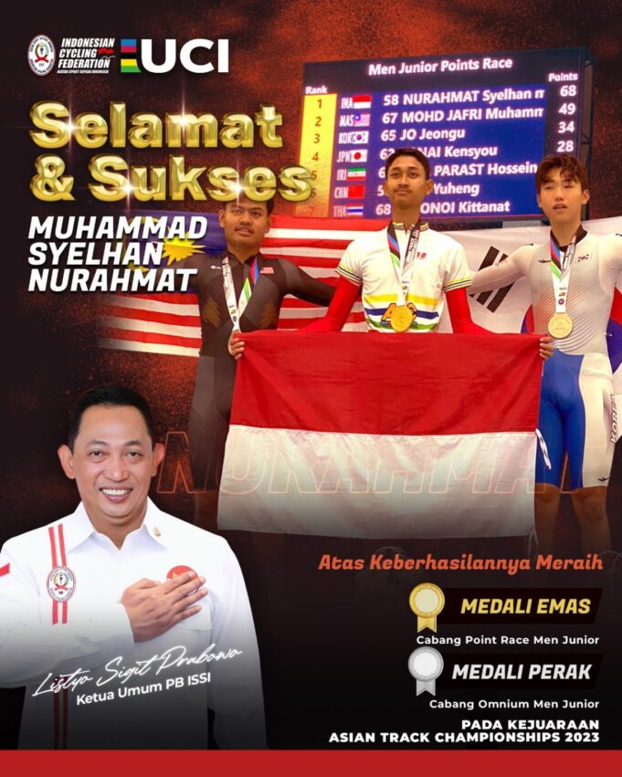“Selamat kepada atlet balap sepeda Indonesia Muhammad Syelhan Nurahmat yang telah berhasil memperoleh medali emas pada cabang Point Men Race Junior dan medali perak pada cabang Omnium Men Junior di Asian Track Championships yang diselenggarakan di Malaysia,” kata Kapolri seperti dikutip dalam akun instagramnya, @listyosigitprabowo, Senin (19/6/2023).