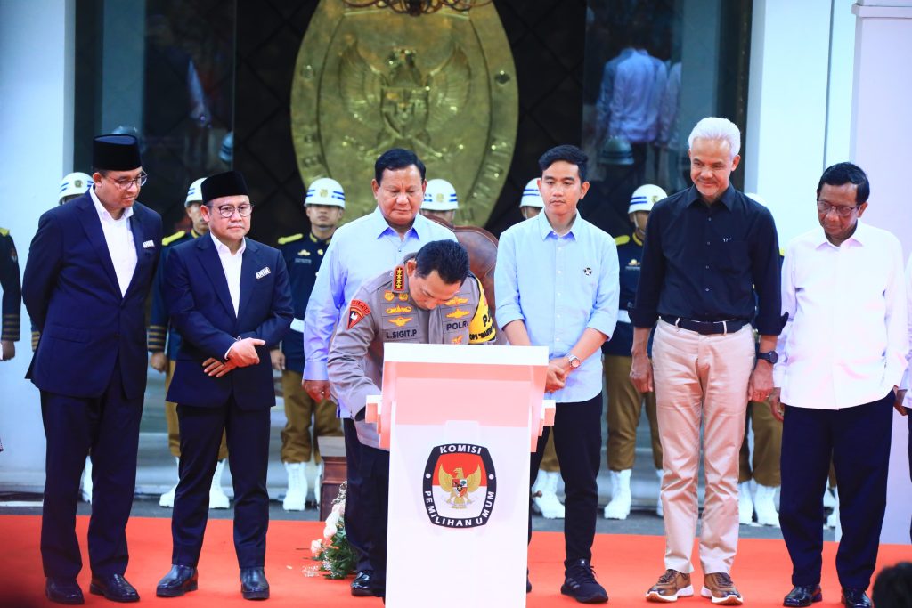 Sebelum deklarasi damai KPU, kapolri dan Panglima TNI menandatangani Deklarasi Kampanye Damai Tertib dan Taat Hukum peserta Pemilu 2024, dalam Rapat Koordinasi Nasional Sentra Penegakan Hukum Terpadu (Gakkumdu) di Hotel Grand Sahid Jaya di Jalan Jenderal Sudirman, Jakarta Pusat, Senin (27/11).