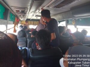 Widang ~ Maspolin.id// Antisipasi timbulnya kejadian Laka lantas serta adanya tindak kejahatan di dalam angkutan umum dalam rangkaian Mudik Balik Lebaran 2022, Kepala Kepolisian Sektor Widang AKP Rukimin, S.H.M.H., menyampaikan imbauan di dalam Bus yang melintas di jalur Pantura depan Kantor Polsek Widang, Selasa (10/05/22).