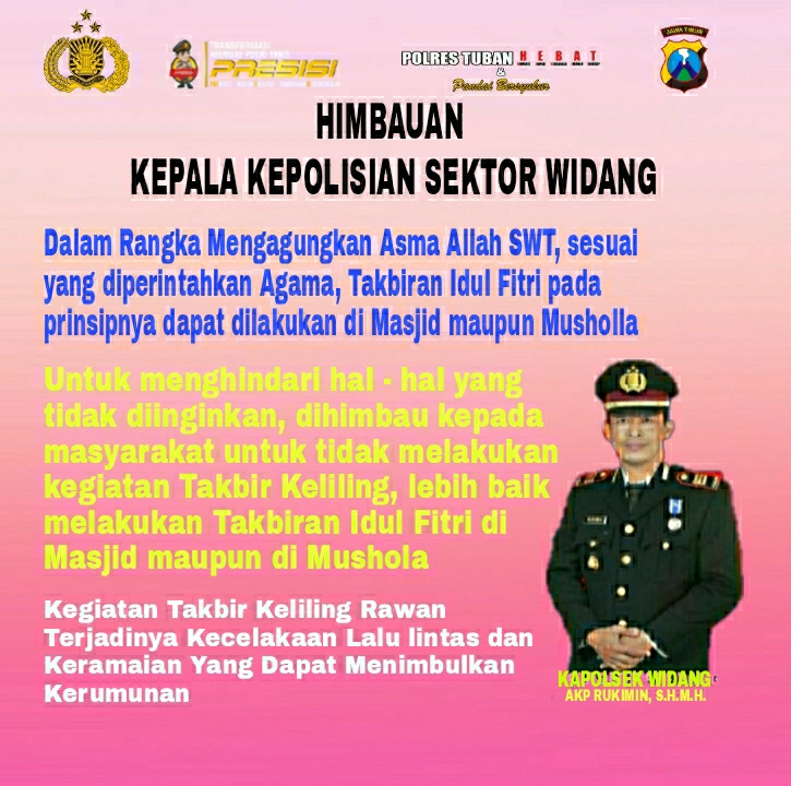 Widang ~ Maspolin.id// Menjelang Malam Takbir Idul Fitri 1443 Hijriah Tahun 2022, Kepala Kepolisian Sektor Widang AKP Rukimin, S.H.M.H., menghimbau para remaja untuk tidak melakukan kegiatan konvoi dan arak-arakan motor saat malam takbiran.