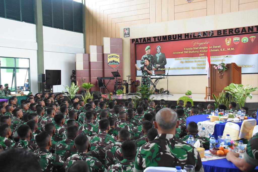 Jakarta – Maspolin.id// Jenderal TNI Dudung Abdurachman, S.E., M.M., didampingi Ketua Umum Persit Kartika Chandra Kirana Ny. Rahma Dudung Abdurachman beserta rombongan bertatap muka dengan para prajurit di ujung utara NKRI tepatnya di Batalyon Komposit 1/Gardapati yang berlokasi di Kabupaten Natuna, Kepulauan Riau, Selasa (4/1/2022). Kunjungan tersebut merupakan bagian dari rangkaian kunjungan kerja Kasad di wilayah Kodam I/BB.