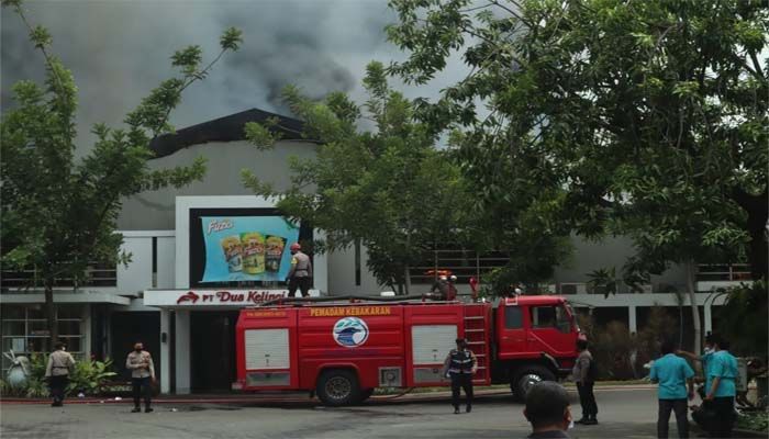 Asap hitam pekat terlihat mengepul ke atas. Sejumlah karyawan juga terlihat panik berada di depan pintu gerbang.