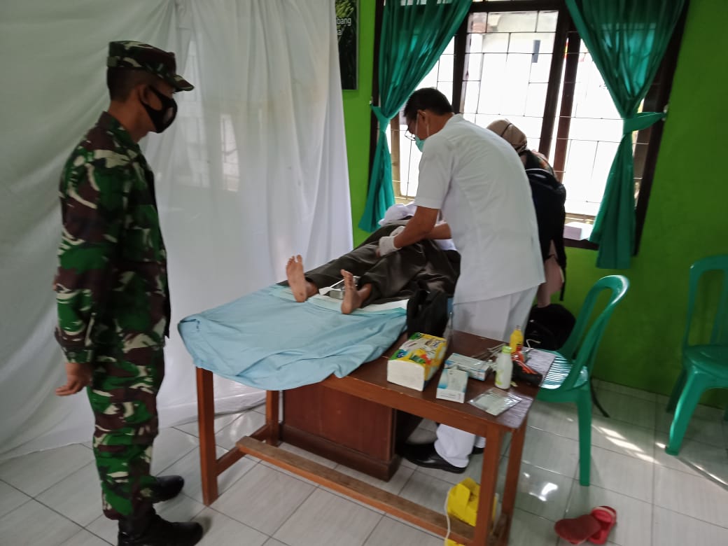Maspolin.id, Cilacap – Babinsa Koramil 14/Cimanggu Serka Dasiman dampingi dan berikan motivasi anak agar tidak takut saat menghadapi sunatan. Hal tersebut disampaikannya kepada puluhan anak yang mengikuti kegiatan sunatan massal di wilayah Kecamatan Cimanggu yang digelar di halaman Kantor Pemerintah Kecamatan Cimanggu, Kabupaten Cilacap, Senin (15/3/2021).