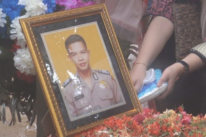 Istri Bripka Afrizal, Mutiah, tak kuasa menahan kesedihan dan tak henti menangis saat suaminya dimakamkan.