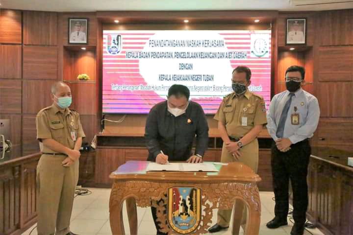 Tuban,maspolin.id- Sekretaris Daerah (Sekda) Tuban, Dr. Ir. Budi Wiyana M.Si menyaksikan penandatanganan naskah kerjasama antara Badan Pendapatan, Pengelolaan Keuangan dan Aset Daerah (BPPKAD) Kabupaten Tuban dengan Kejaksaan Negeri (Kejari) Tuban tahun 2021 di ruang rapat Dandang Wacono Pemkab Tuban, Selasa,10/08/2021.