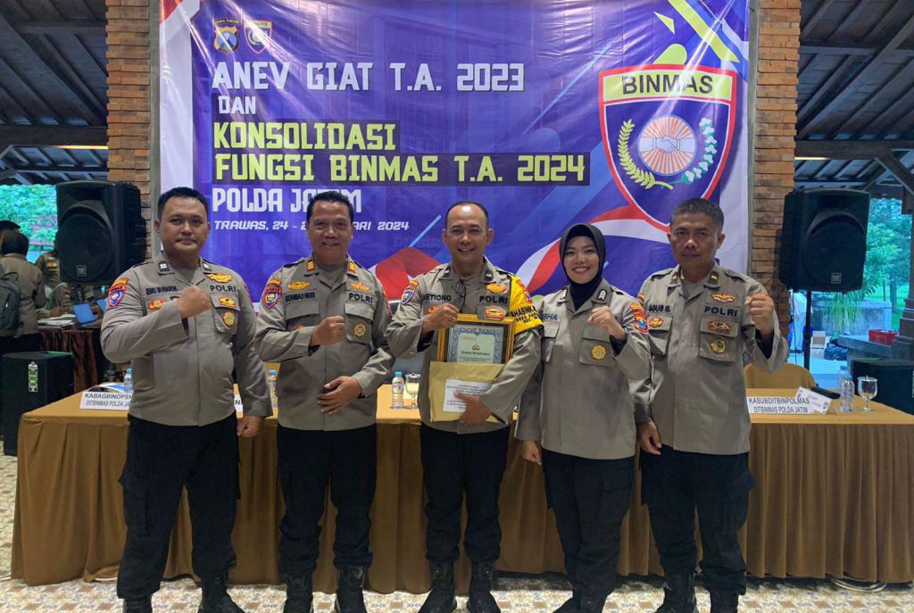 Penghargaan Kapolda Jatim itu sendiri diserahkan oleh Direktur Pembinaan Masyarakat (Dirbinmas) Polda Jatim Kombes Pol Asep Irpan Rosadi, S.I.K., M.PA. bersamaan dengan digelarnya Analisa dan Evaluasi (Anev) Tahun 2023 dan konsolidasi fungsi Binmas Tahun 2024 di Ubaya Training Center Trawas Mojokerto. Rabu, (24/1).