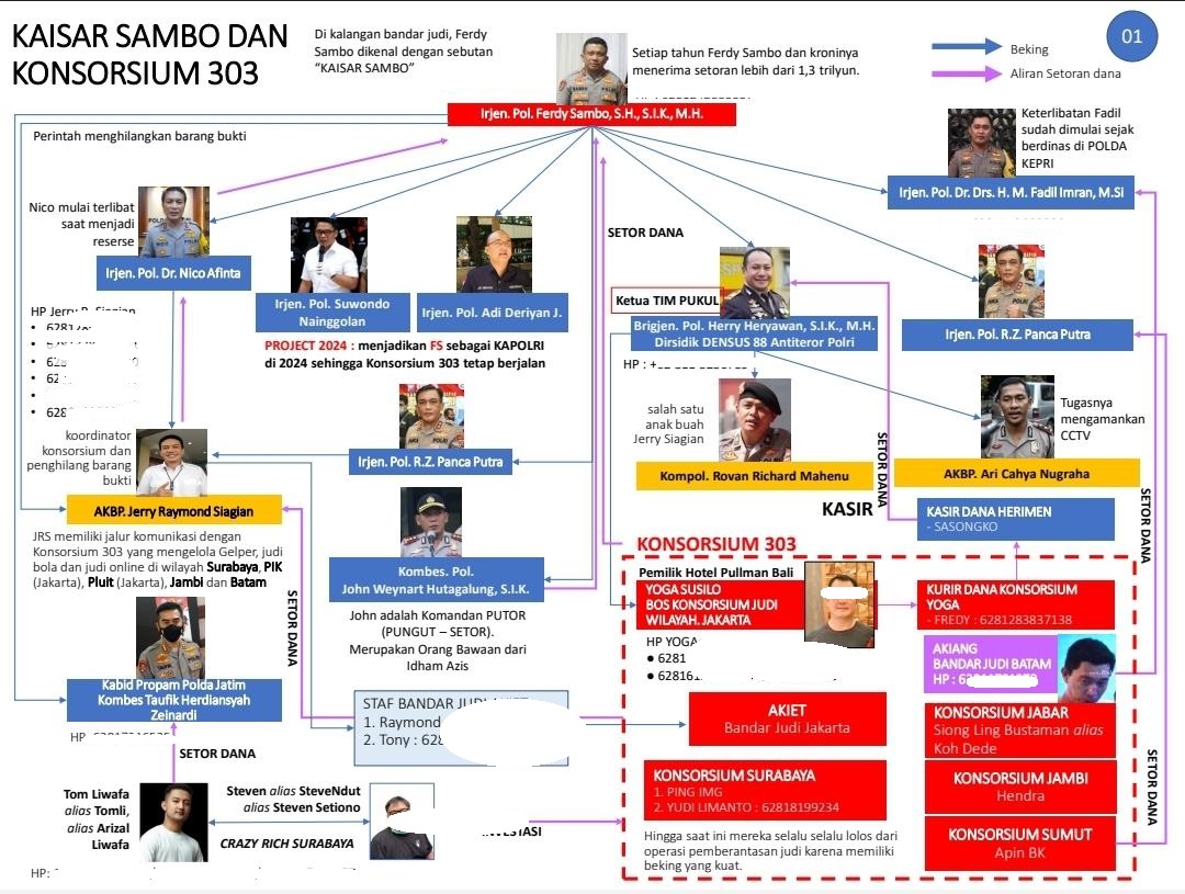 Konsorsium 303 mulai beredar bebrapa hari lalu di jejaringan sosial media, di mana dalam grafik tersebut mengambarkan tentang hubungan Kekaisaran Sambo dan Konsorsium 303.