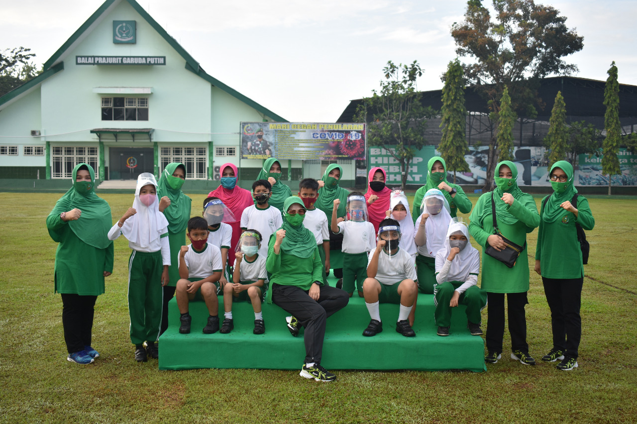 Kegiatan berbagi ceria bersama anak-anak SD Yayasan Kartika Jaya ini berupa olah raga, bermain dan sarapan bersama di lapangan Makorem 042/Gapu, Jumat 24/07/2020.