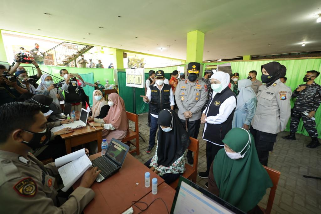 MASPOLIN || SURABAYA – Forkopimda Jawa Timur, Sabtu siang (7/8/2021) melakukan pengecekan pelaksanaan vaksinasi Merdeka berbasis komunitas Pensantren di Pondok Pesantren (Ponpes) Sabillurrosyad Gasek, Malang.