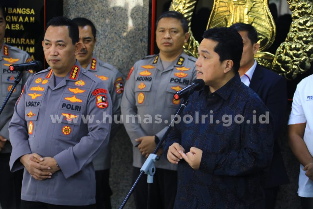 “Tentu saya mengucapkan terima kasih kepada Bapak Kapolri dan jajarannya terutama dari dibentuknya tim yang sudah berjalan sejak bulan Maret dan juga hari ini hadir saya ajak Dirut PT Liga dan Ketua PTN dan ini memang sejak awal saya dan Kapolri diinstruksikan oleh bapak Presiden agar memang menciptakan iklim sepakbola yang bersih karena ini penting buat juga kita mendorong liga kita menjadi nomor satu di Asia Tenggara dan terciptanya tim nasional yang memang sangat bisa bertanggung jawab sehingga meraih prestasi dengan baik,” ujar Erick Thohir saat jumpa pers bersama Kapolri di Mabes Polri, Jalan Trunojoyo, Kebayoran Baru, Jakarta Selatan, Senin (26/6/2023).