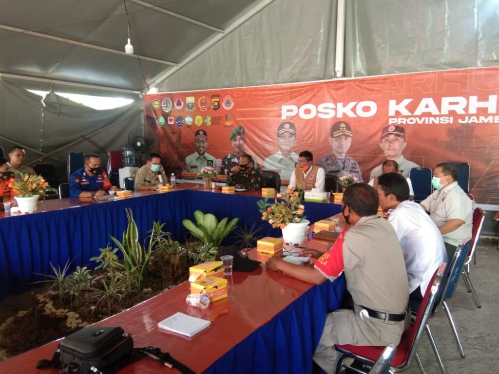 Briefing Posko Satuan Tugas Karhutla Prov. Jambi, hari Rabu ini selain dihadiri Danrem dihadiri juga oleh Marsma TNI (Purn) Arif Ichwan Koordinator LO BNPB dan Kol (Purn) Alex Baloek wakil koordinator LO BNPB dan dipimpin oleh H.Doddy Chandra, SH dari BPBD Prov Jambi.