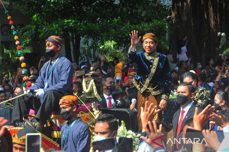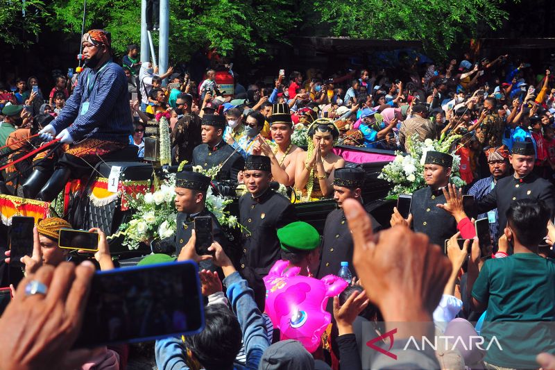 Pasangan pengantin Kaesang Pangarep dan Erina Gudono (tengah) menaiki kereta saat prosesi kirab Ngunduh Mantu di jalan Selamet Riyadi, Solo, Jawa Tengah, Minggu (11/12/2022). Kirab ngunduh mantu pernikahan putra bungsu Presiden Joko Widodo, Kaesang Pangarep dan istrinya Erina Gudono yang dimulai dari Loji Gandrung menuju Pura Mangkunegaran tersebut disaksikan ribuan masyarakat Solo dan sekitarnya. ANTARA FOTO/Yusuf Nugroho/pras.