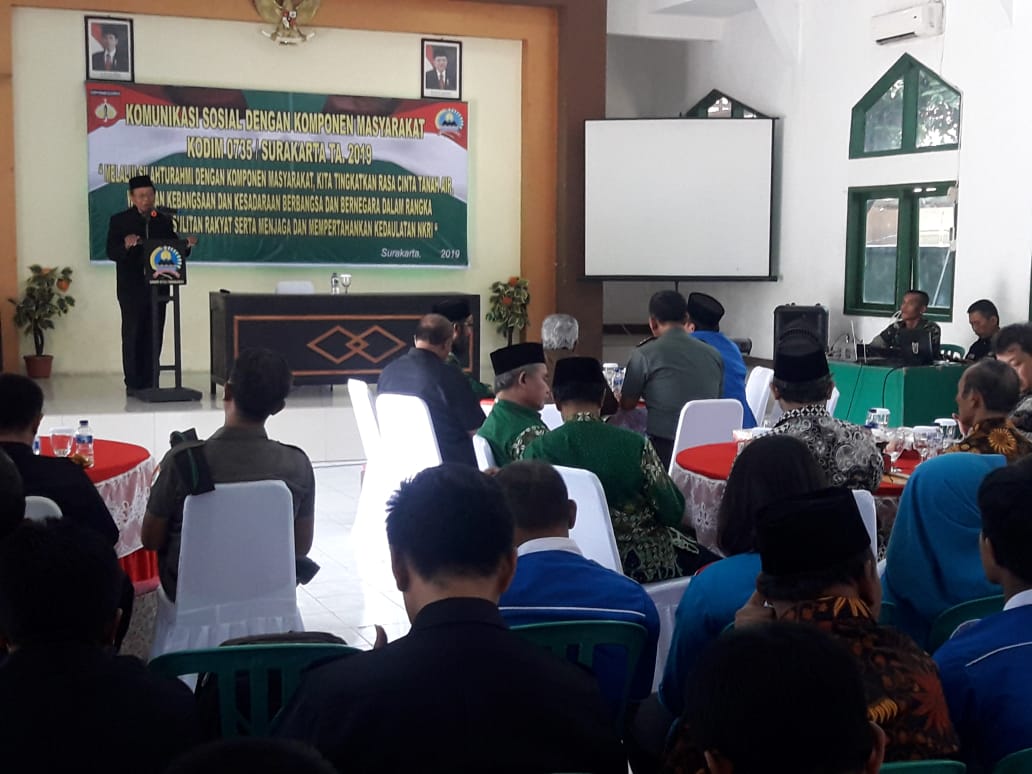 Kegiatan Komunikasi Sosial dengan komponen masyarakat dipimpin langsung oleh Komandan Kodim 0735/Surakarta Letkol Inf Ali Akhwan S.E, dan dihadiri oleh Ketua FKUB Surakarta Drs Subari, Ketua KNPI Surakarta Drs Bambang, Para tokoh agama (Toga), Tokoh Adat (Todat), dan dan Tokoh Masyarakat (Tomas) wilayah Surakarta.