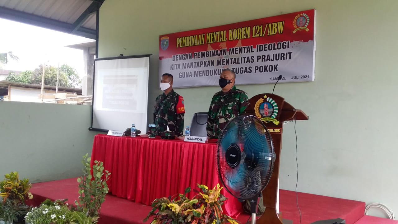 Sambas,maspolin.id- Tim Bintalrem 121/Abw mensosialisasikan Pembinaan Mental Ideologi kepada prajurit Kodim 1208/Sambas, kegiatan tersebut berlangsung di garasi Makodim 1208/Sambas, Jalan Tabrani, Desa Lumbang, Kecamatan Sambas, Kabupaten Sambas, Kamis (1/7/21).