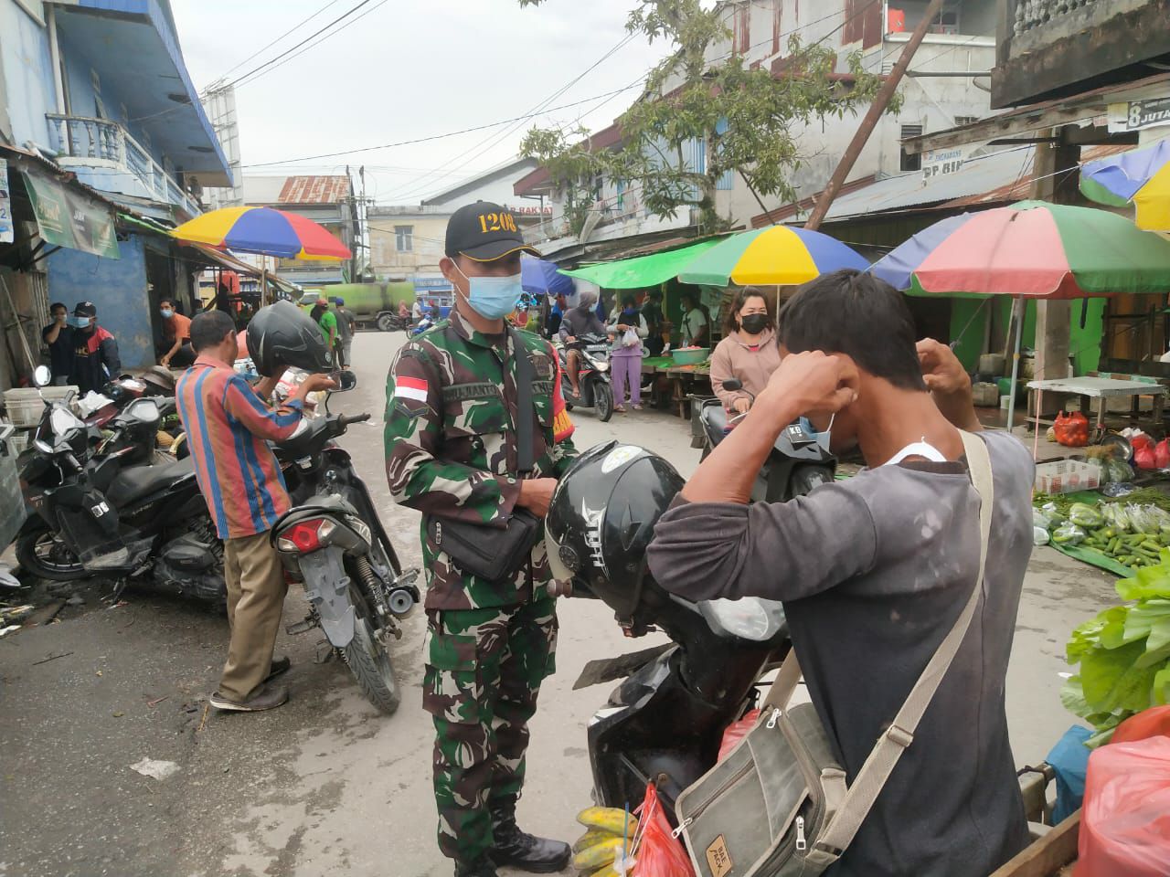 Anggota Koramil 1208-03/Tebas melaksanakan pembagian masker, himbauan protokol kesehatan, pengendalian penumpukan warga dan mengawasi jaga jarak di Pasar Desa Tebas Sungai, kegiatan dilaksanakan bersama Forkopimcam Tebas dan dihadiri, Plt Camat Tebas, Anggota Koramil 03/Tebas, Polsek Tebas, Serta Anggota Puskesmas Tebas.