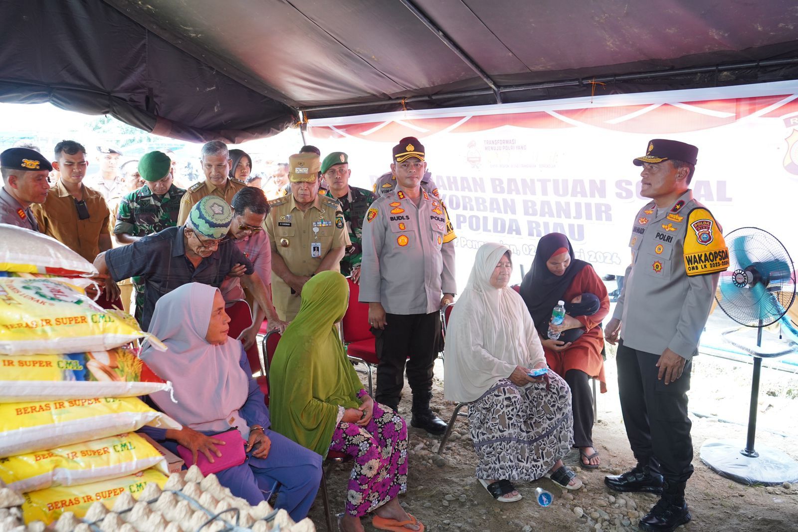 RIAU – Maspolin.id|| Bantuan ini diserahkan oleh Wakapolda Riau, Brigjen. Pol. Drs. Kasihan Rahmadi, S.H., M.H., saat melakukan kunjungan ke warga yang terkena banjir di Rohul, Selasa (2/1/24).
