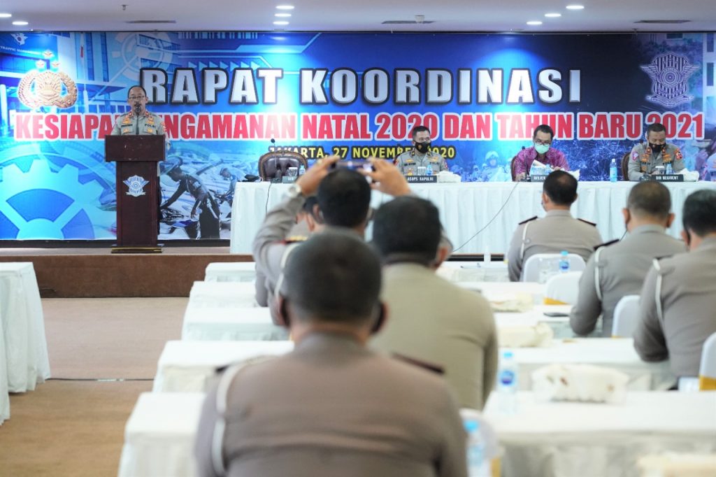 MASPOLIN || JAKARTA – Menghadapi libur Natal dan Tahu Baru 2021, Korlantas Polri menggelar Rapat Koordinasi Kesiapan Operasi Lilin Tahun 2020 yang dihadiri oleh Karodalops Asops Kapolri Brigjen Pol Endi Sutendi, Dir Regident Korlantas Polri Brigjen Pol Yusuf, Perwakilan dari Dirhubdat, Bina Marga, stakeholder terkait, dan seluruh Dirlantas se-Indonesia serta para pejabat utama Korlantas Polri. Acara digelar Aula Madelu Gedung NTMC Polri, Jakarta. Jumat (27/11/2020).