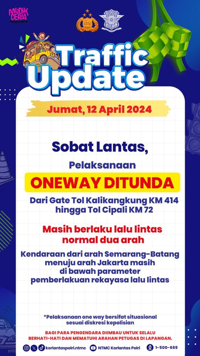 JAKARTA – Maspolin.id|| Pelaksanaan rekayasa lalu lintas one way yang sedianya dimulai Jumat (12/4/2024) pukul 14.00 resmi ditunda. Adapun one way diberlakukan dari Tol Kalikangkung KM 414 hingga Tol Cikopo-Palimanan (Cipali) KM 72.