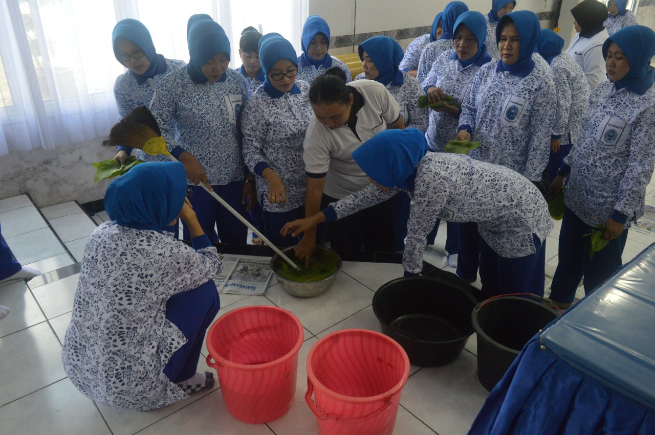 Para istri dan Pengurus Cabang 4 bersama-sama belajar dan praktek ecoprint yang unik ini di Gedung Mandalika Mako Lanal Semarang, Jawa Tengah.