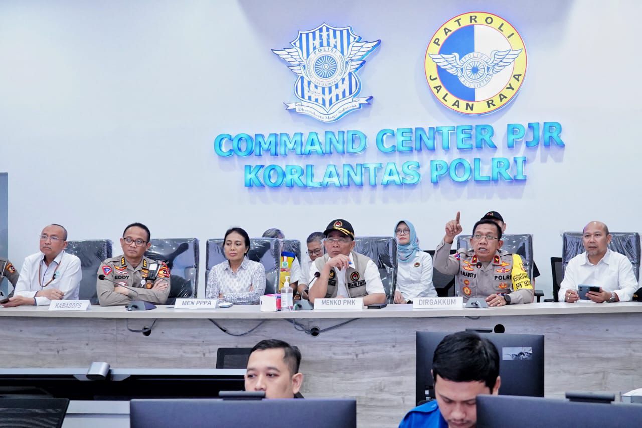 Cikarang, JAWA BARAT – Maspolin.id|| Menko PMK Muhadjir Effendy didampingi Menteri Pemberdayaan Perempuan dan Perlindungan Anak (PPPA) Bintang Puspayoga mengunjungi Command Center KM 29, Gerbang Tol Cikarang Utama, Bekasi, Kamis (4/4/2024).