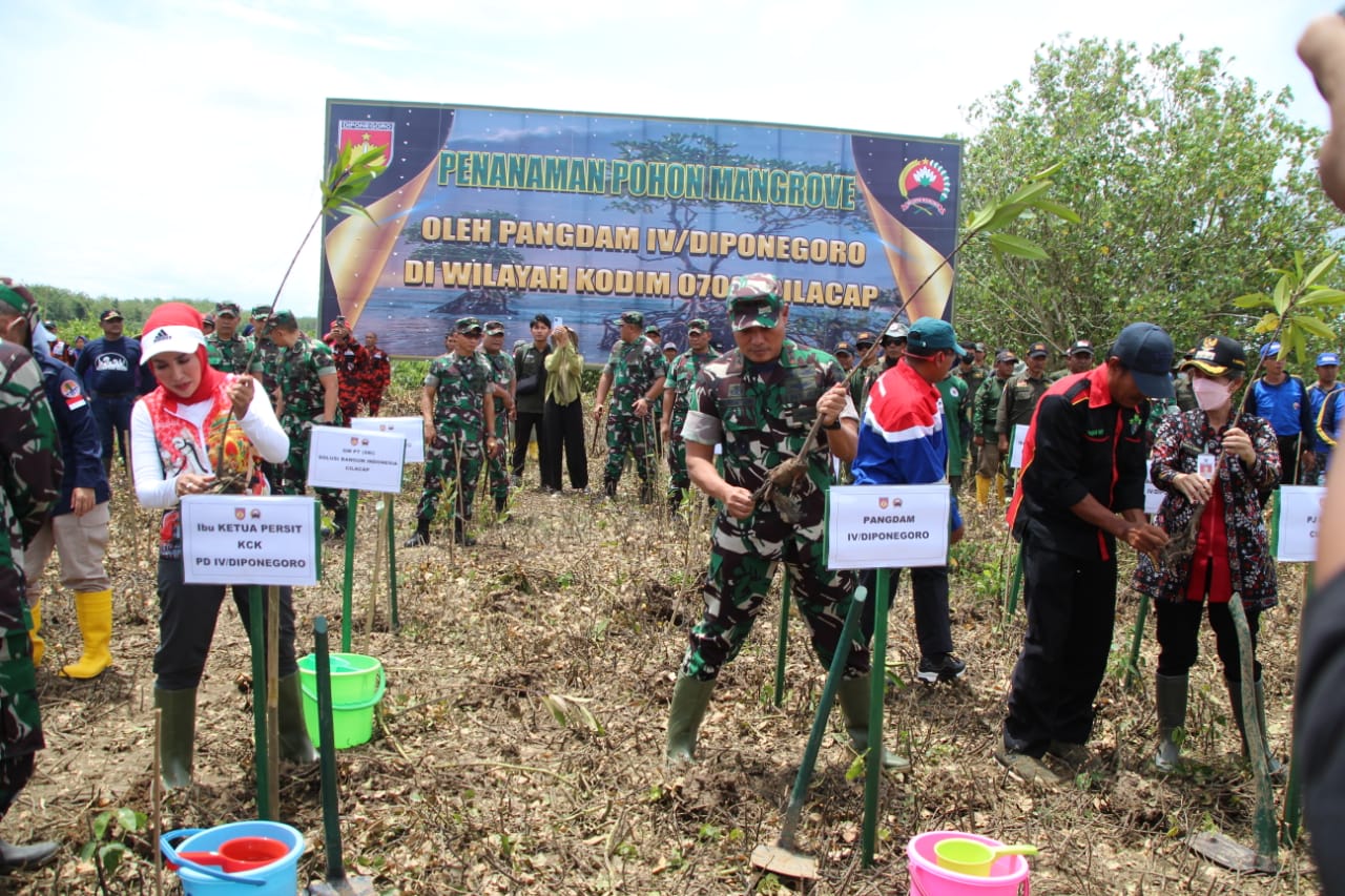 Cilacap – Maspolin.id|| Dalam agenda kunjungan kerja (Kunker) ke wilayah Kodim 0703 Cilacap, Panglima Kodam (Pangdam) IV Diponegoro Mayjen TNI Widi Prasetijono melaksanakan kegiatan penanaman pohon mangrove berlokasi di Desa Tritih Lor, Kecamatan Jeruklegi, Kabupaten Cilacap, Rabu (15/02).