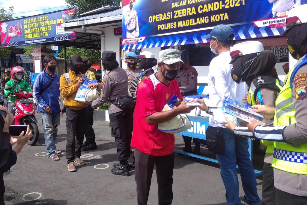 Magelang – Maspolin id // Polres Magelang Kota Polda Jateng menggelar Operasi Zebra Candi 2021 dengan tindakan humanis dan persuasif. Operasi ini dibarengi dengan kegiatan Bakti Sosial pembagian paket sembako dan masker, yang dipusatkan di Mako 2 Polres Magelang Kota, Jumat (26/11/2021).