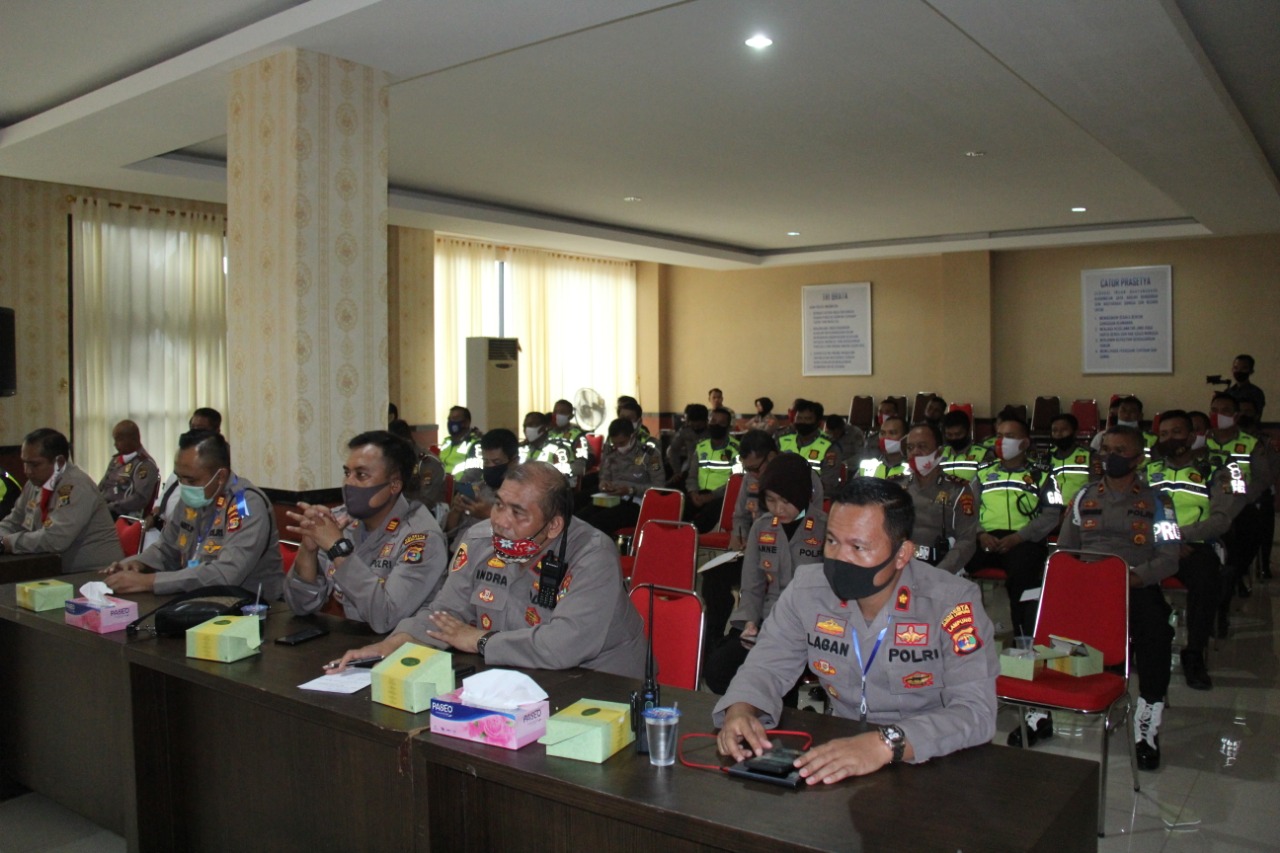 MASPOLIN || Bandar Lampung (Lampung) — Menjelang pelaksanaan Operasi Kepolisian Operasi Patuh Krakatau 2020, Polresta Bandar Lampung melaksanakan latihan sebelum operasi atau Lat Pra Ops, Senin (20/07/2020), dilaksanakan di Aula Patria Tama Polresta Bandar Lampung.