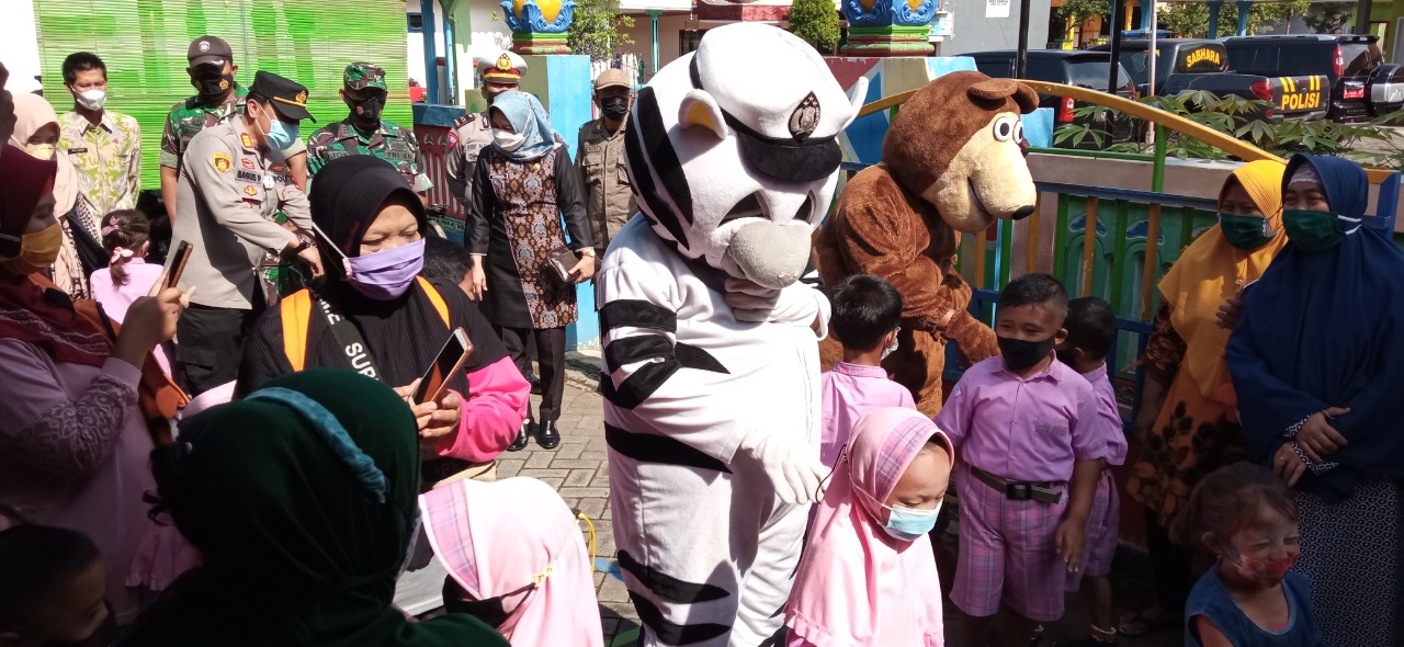 Probolinggo, maspolin.id – Kepolisian Resor Probolinggo melalui Polsek Dringu libatkan dua orang anggotanya untuk menjadi badut di lokasi vaksinasi merdeka anak. Hal itu dilakukan, untuk menghibur siswa taman kanak-kanak (TK) yang divaksin dosis pertama.