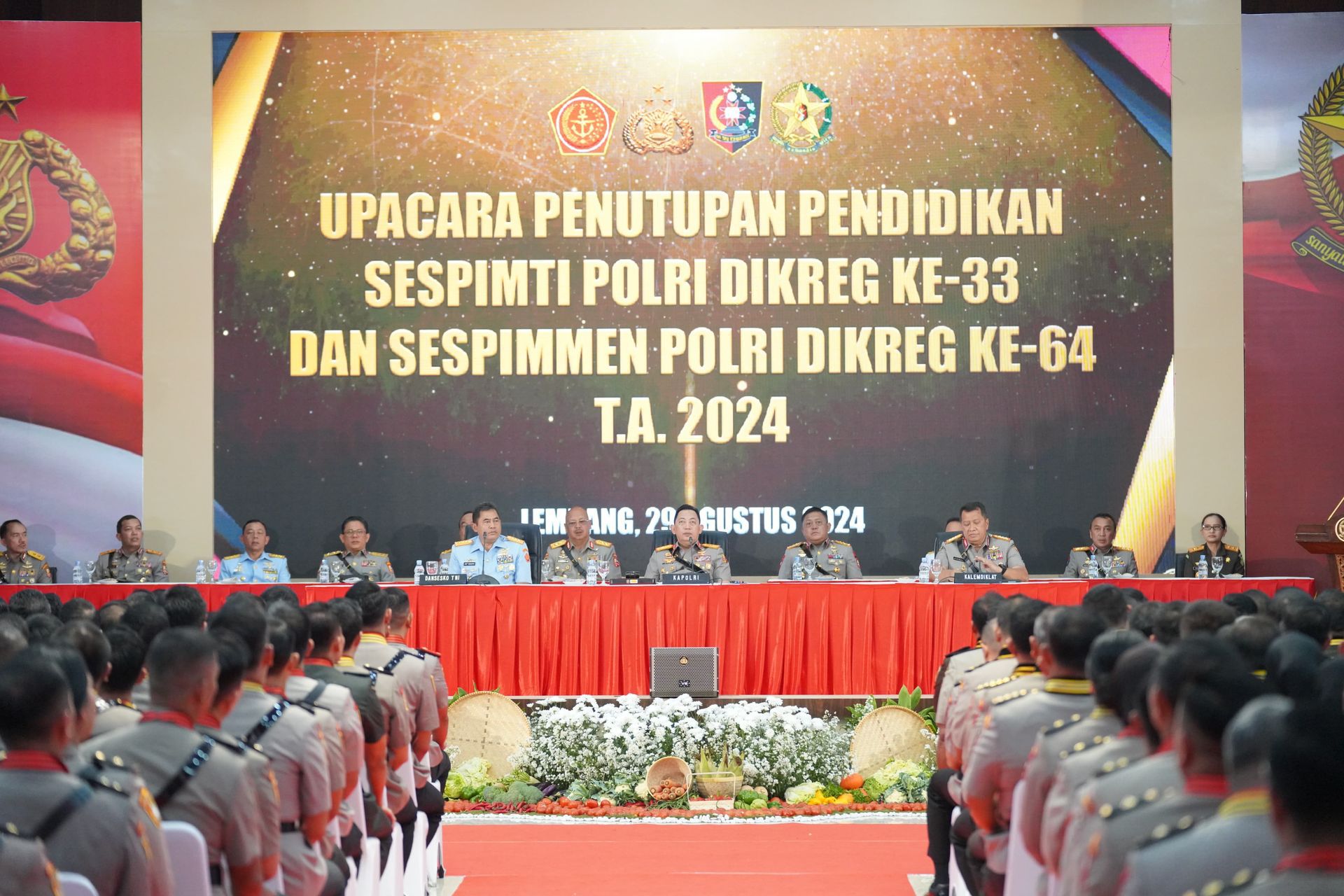 JAKARTA – Maspolin.id|| Kapolri Jenderal Polisi Drs. Listyo Sigit Prabowo menutup pendidikan Sespimti Dikreg ke-33 dan Sespimen Dikreg ke-64 Tahun Ajaran 2024. Turut hadir dalam acara sejumlah pejabat utama Mabes Polri dan tentunya Kepala SSP Lemdiklat Polri Irjen. Pol. Chrysnanda Dwilaksana.