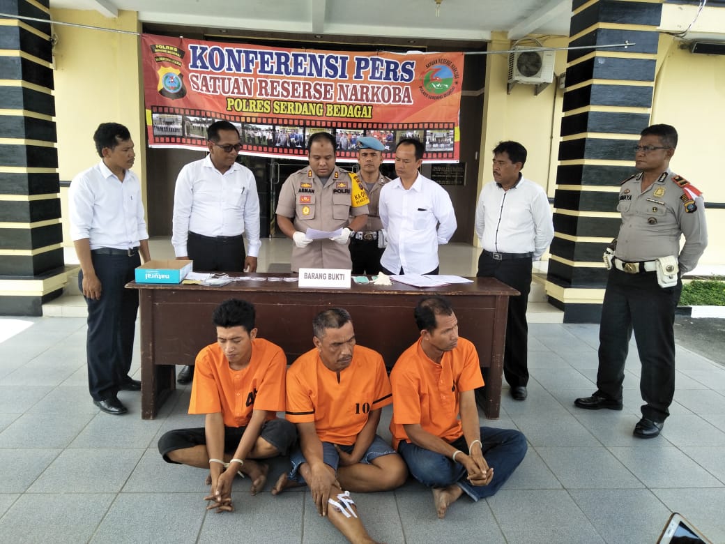 “Tadinya polisi menerima informasi dari masyarakat sekitar dusun III Gg Pancing Desa Pantai Cermin Kanan, atas maraknya peredaran narkoba didesa tersebut. Selanjutnya petugas melakukan Undercover bay dengan tersangka Herman (42) alias Alo warga dusun II Desa Kota Pari Kecamatan Pantai Cermin dengan membeli 1 paket sabu 0,14 gram seharga Rp 50 ribu rupiah,” kata Kapolres Sergai AKBP Juliarman didampingi Kasatresnarkoba AKP Martualesi Sitepu SH,MH.