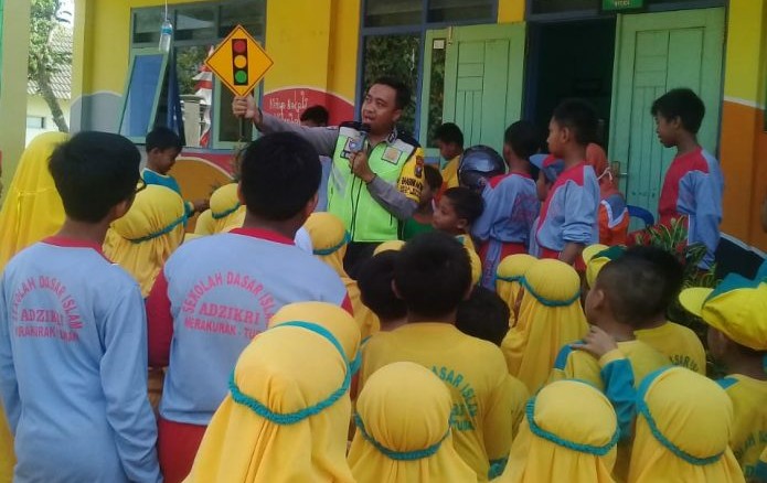 Seperti halnya di lakukan oleh anggota Polsek Merakurak jajaran Polres Tuban yaitu Bripka Wahyudi Utomo memberikan Pengenalan tentang lalulintas di SDI Adzikri Desa Tuwiriwetan Kec. Merakurak Kab. Tuban, pada hari Jumat, 30 Agustus 2019.Pagi
