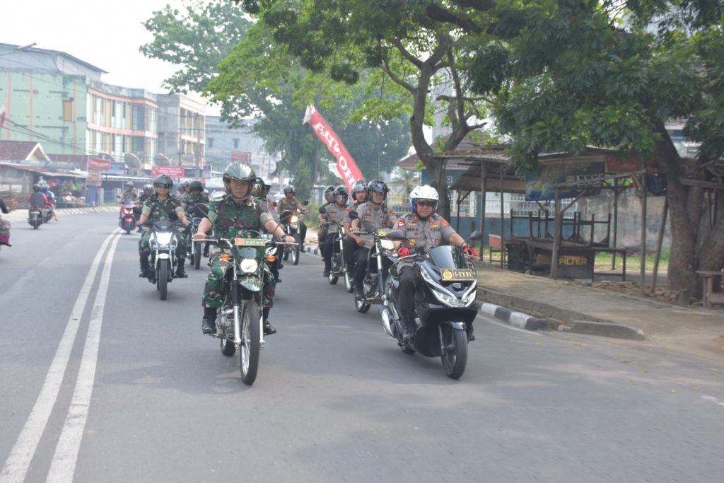 Puluhan kendaraan sepeda motor milik Polisi dan TNI yang dikendarai sendiri oleh Kapolda dan Danrem bersama-sama melakukan patroli keliling Kota Jambi melihat dan menantau langsung kondisi situasi keamanan di beberapa sudut kota untuk memastikan situasi aman dan kondusif.